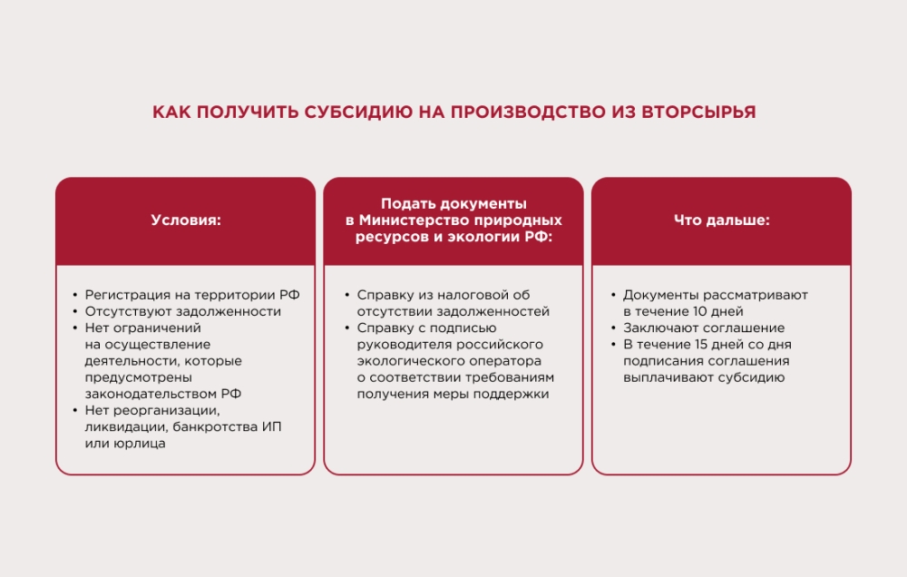 Все ИП и ООО, которые производят любую продукцию из вторичного сырья, могут рассчитывать на помощь от государства. Но есть ряд требований, которым должен соответствовать бизнес, например: