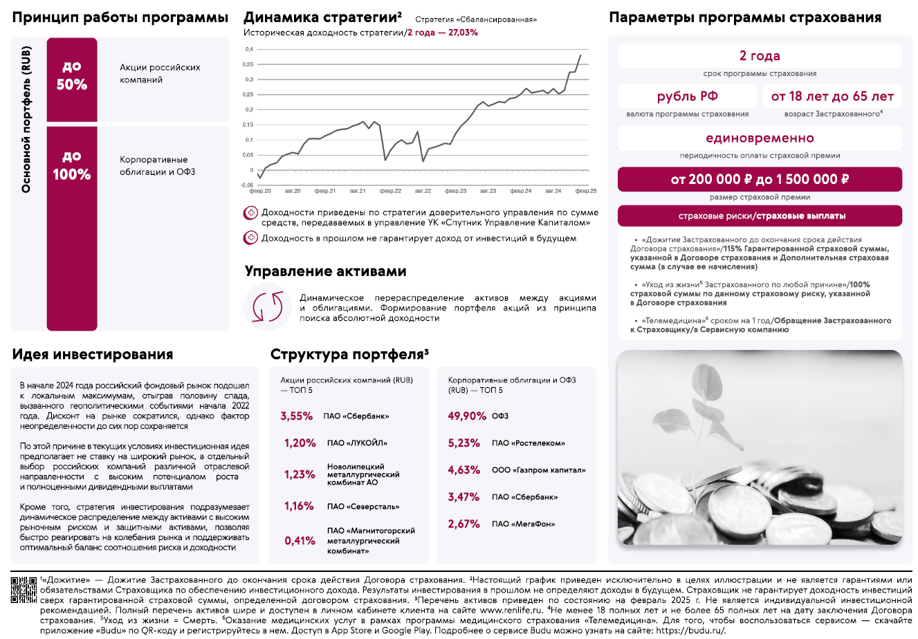 В продукте предусмотрена выплата гарантированной страховой суммы в размере 115%, это значит, что даже при падении фондового рынка вы получаете доход.