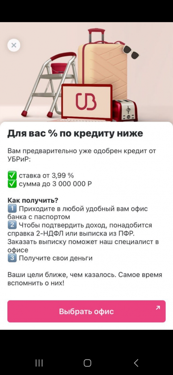Такие предложения могут прийти в SMS или в виде push-уведомления в приложении банка. Они не являются персонализированными, но банк считает вас надежным заемщиком и готов одобрить кредит. Отличить их от окончательного одобрения просто: в сообщениях указана минимальная ставка и максимально возможная сумма кредита с формулировками «от» и «до».