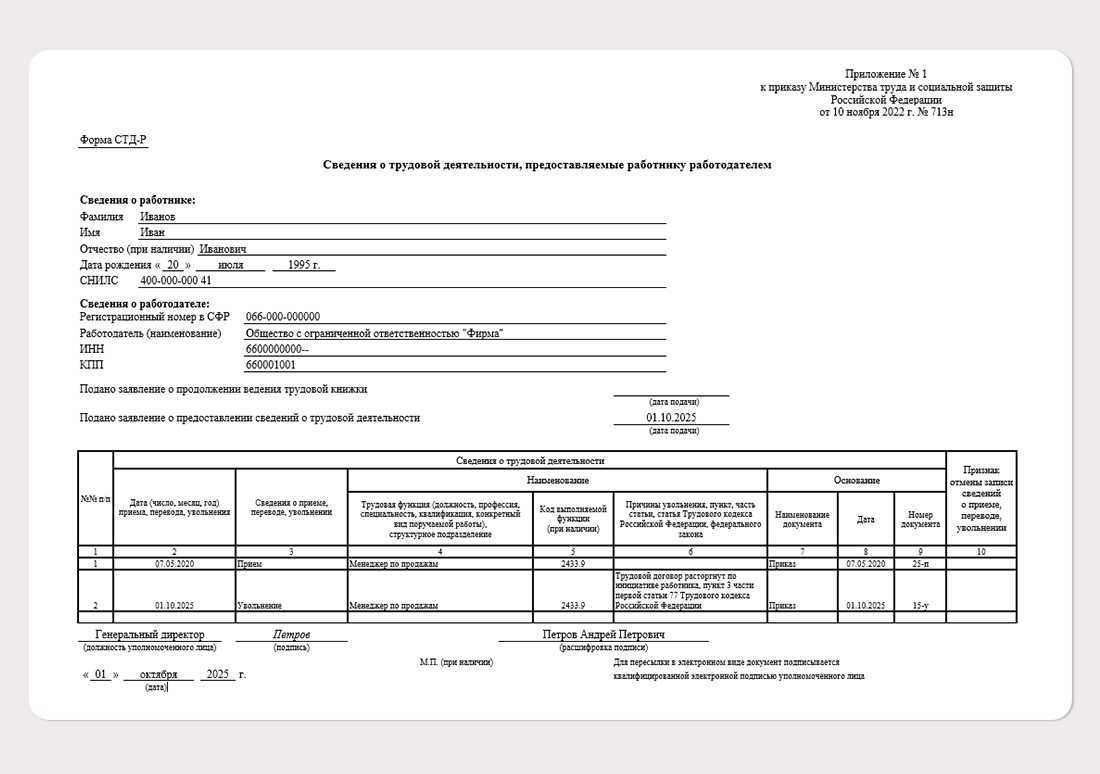 Сведения о трудовой деятельности по форме СТД-Р, если у работника была электронная трудовая книжка. СТД-Р выдают в виде бумажного бланка с подписью сотрудника отдела кадров и печатью компании или в электронной форме, подписанной усиленной квалифицированной электронной подписью (УКЭП).