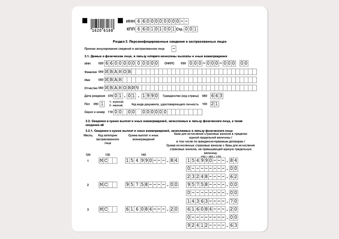 Выписка из раздела 3 формы расчёта страховых взносов (РСВ), которая содержит персонифицированную информацию о медицинском, пенсионном и социальном страховании работника за квартал. В бланке необходимо указать сумму начисленных доходов и уплаченные взносы по видам страхования за три месяца квартала, в котором сотрудник увольняется.