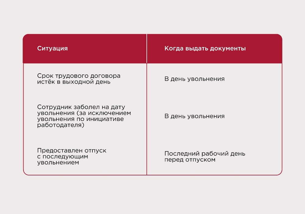 Есть нестандартные ситуации, когда трудовой договор заканчивается в выходной день или работнику предоставлен отпуск с последующим увольнением. В таблице дали подсказки, как действовать в таких случаях.