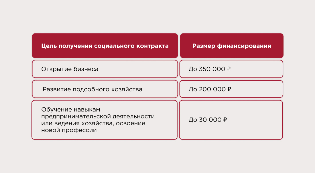 Для предпринимателей есть три направления, по которым можно заключить социальный контракт. Для каждой цели предусмотрены свои размеры выплат.