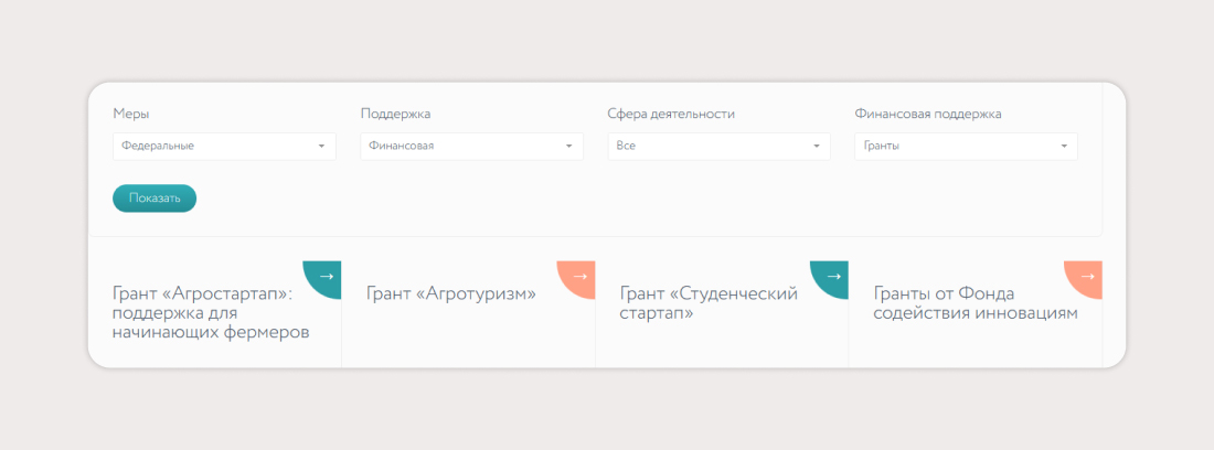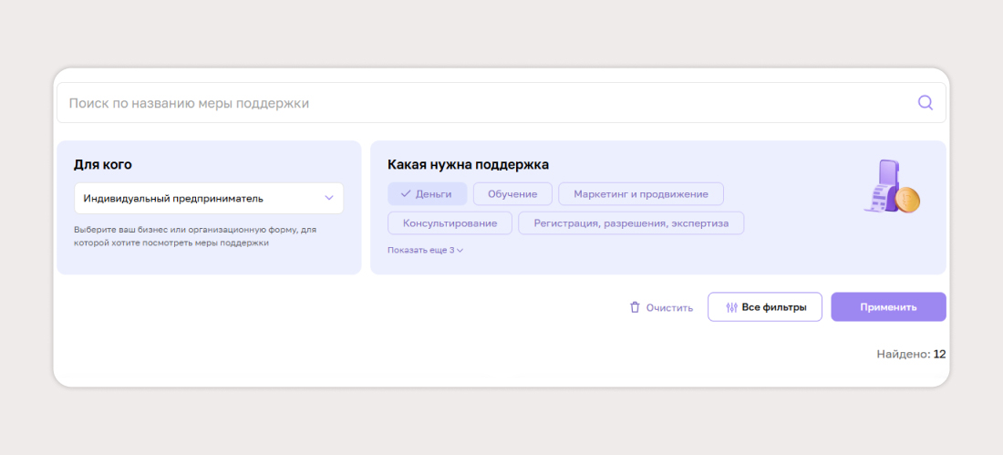 Для подбора программы поддержки есть возможность использовать поисковую строку или фильтры