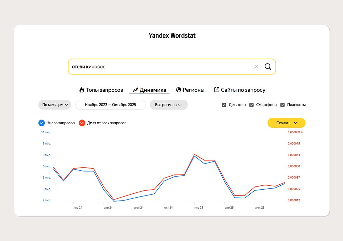 Кроме спроса, важно понимать сезонность. Это поможет точно прогнозировать выручку, правильно формировать ценник и планировать наём персонала. Чтобы проверить сезонность, используйте Яндекс Вордстат. Введите запросы вроде «отели [город]», «гостиница [город]», «куда поехать [регион]» и посмотрите, когда возникают пики интереса — это и есть сезонность.