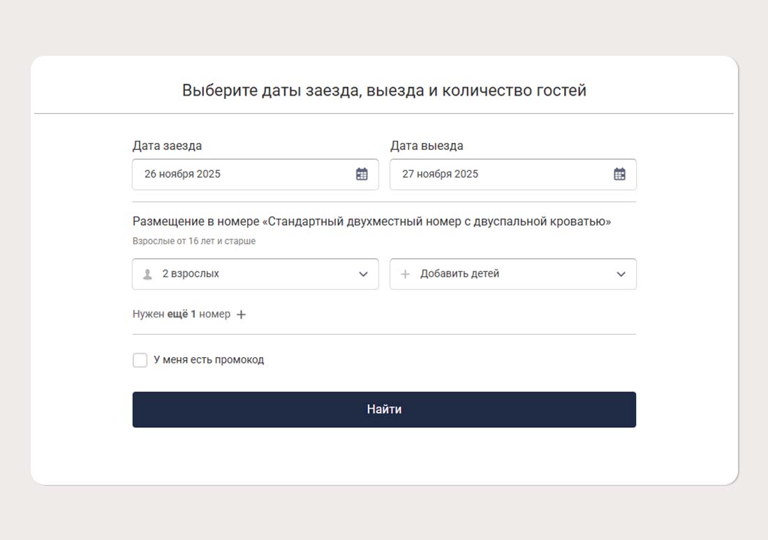 Не стоит размещать форму заявки с кнопкой бронирования через сайт или мессенджеры. Пользователям удобнее самим выбрать свободную дату в календаре и оплатить номер, без длительных переписок.