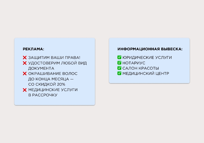 Вывеска не должна призывать купить продукт, иначе её могут признать рекламой. Чтобы разместить такую вывеску, потребуется разрешение муниципальных органов — в соответствии со статьёй 19 закона «О рекламе».