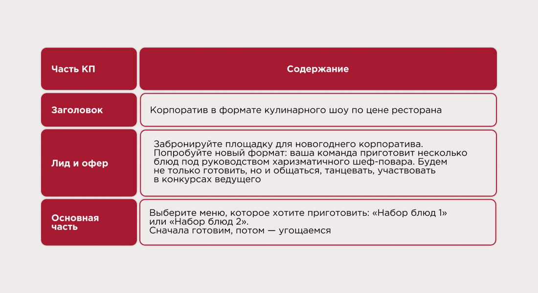 Это первый абзац КП, где компания пишет о проблеме конкретного клиента, а потом указывает путь для её решения. В офере (продающем предложении) важно коротко раскрыть выгоду: низкие цены, быстрая доставка или интересные дополнительные опции.