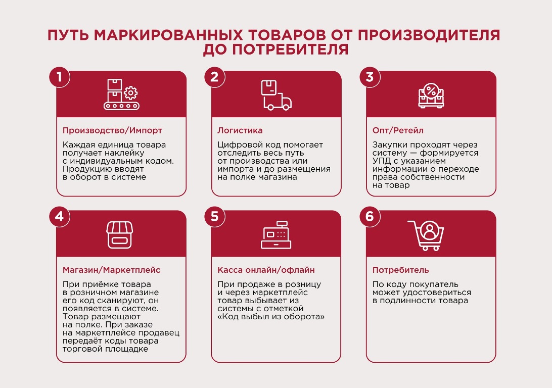 В системе каждой единице товара присваивается индивидуальный код-идентификатор (маркировка). Это помогает отследить весь путь: с момента производства или ввоза в РФ до продажи конечному потребителю. Маркировка позволяет защититься от подделок, делает цепочку товарооборота прозрачной, что помогает отслеживать качество продукции и её безопасность для здоровья потребителей.