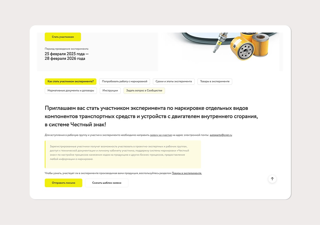Желающие принять участие в рабочей группе отправляют заявку по электронной почте. Подробную информацию об экспериментах можно найти на сайте «Честного знака» в категории «Пилотные проекты»