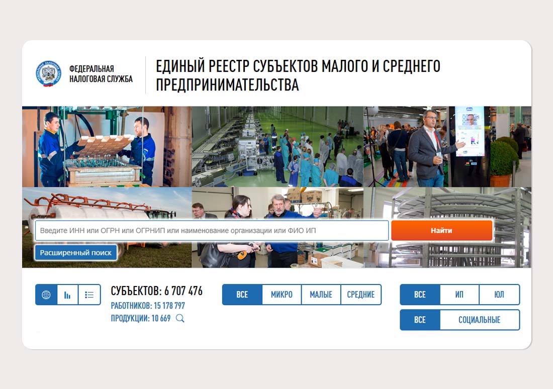 На сайте можно не только проверить наличие компании или ИП в реестре, но и посмотреть статистику по микро-, малым, средним предприятиям