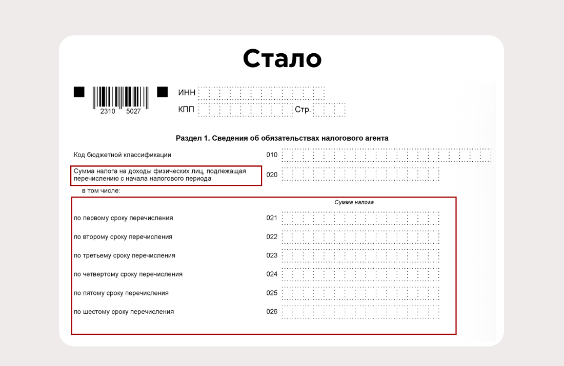 Также добавились новые поля: 021–026. Если речь идёт о квартале, то в эти строки нужно занести суммы, которые рассчитали и удержали за каждый из шести сроков периода. Когда заполняете годовой отчёт, то в строке 026 укажите налог, который нужно заплатить в последний рабочий день за 23–31 декабря.