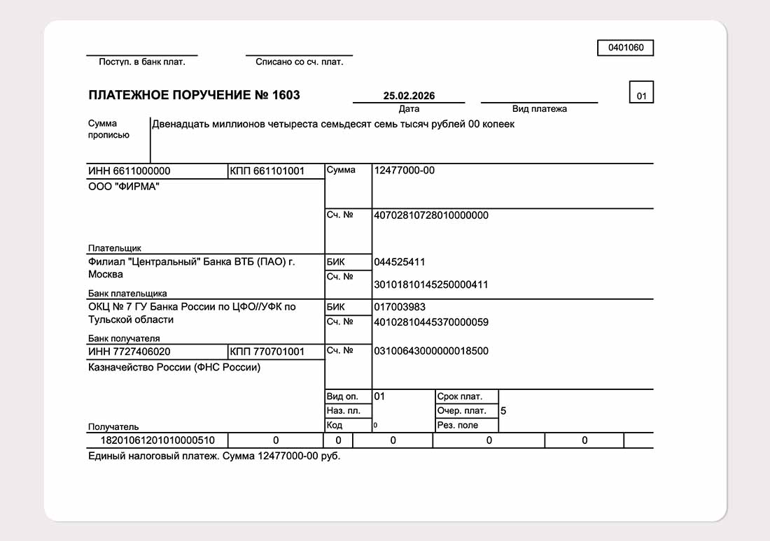 Пример заполнения платёжного поручения по ЕНП на единый налоговый счёт с общим КБК