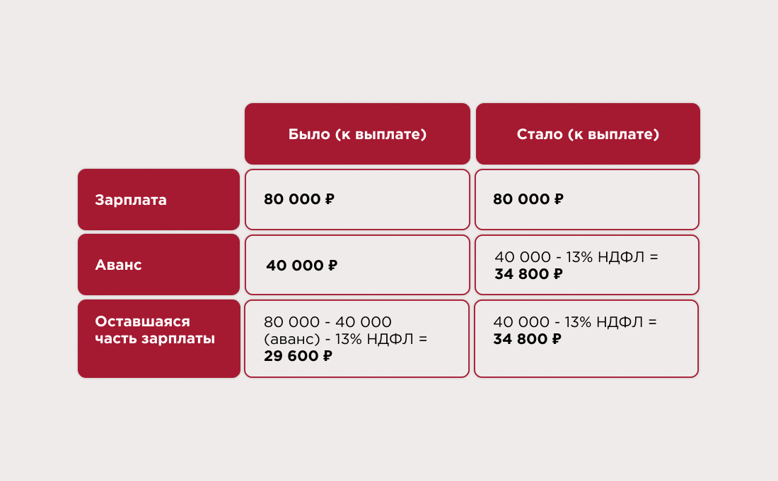 Например, работнику платят зарплату за первую половину месяца (раньше он назывался авансом) 20 июня, а вторую часть зарплаты — 5 июля. Для июня датой получения дохода было 30 июня, то есть последний день месяца. Из-за этого НДФЛ не удерживали с аванса, а весь вычитали из второй части зарплаты.
