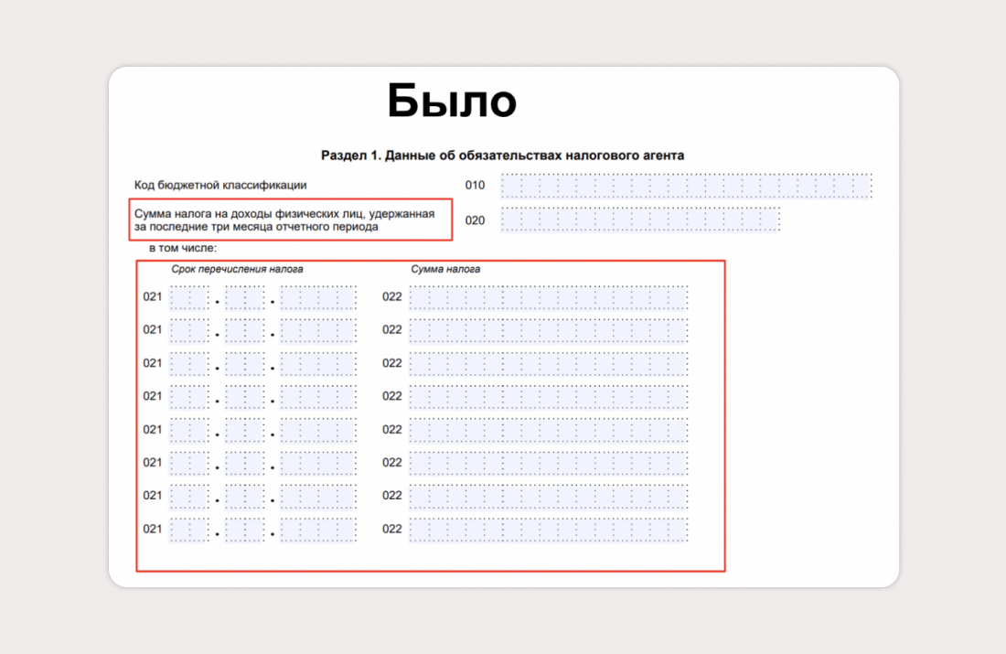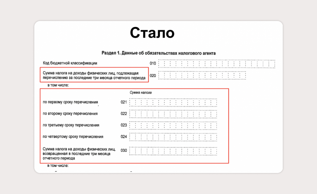 С 2023 года обновили первый раздел отчёта 6-НДФЛ. Раньше в поле 020 указывали налог, который удержали по всем сотрудникам за квартал. Сейчас в строке нужно прописать НДФЛ, который перечислят в бюджет.