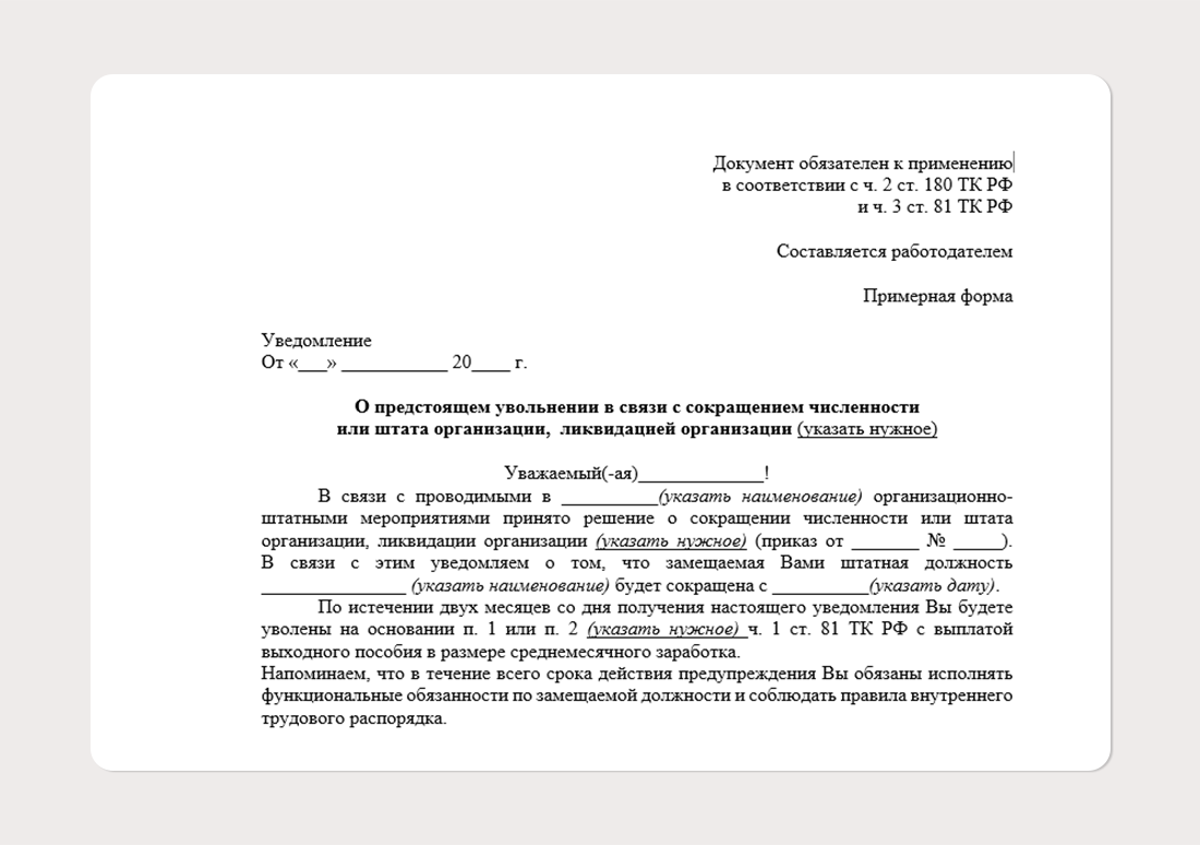 Уведомление составляют в свободной форме. Один экземпляр с подписью работника остаётся у работодателя, второй — у сотрудника. Шаблон уведомления работника о сокращении и другие кадровые документы можно найти на портале «Работа в России».
